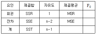다음은 단쉰회귀모형 y1=β0+βixi+ϵi (i=1,2,…, n), ϵi ~ N(0,σ2)에 대해 최소제곱추정법을 적용한 분산분석표이고,