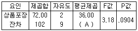 [사회통계] 다음 분산분석(ANOVA)표는 상품포장색깔(빨강, 노랑, 파랑)이 판매량에 미치는 영향을 알아보기 위해서 4곳의 가게를 대상으로 실험한 결과이다. 분산분석표에서 잔차 평균제곱 A 값은 얼마인가?