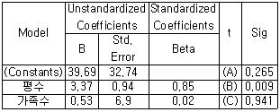 = 36.689 + 3.372X1 + 0.532X2의 회귀계수표 이다. 다음 ( )에 알맞은 값은?