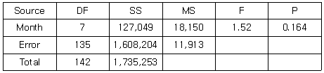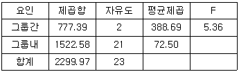다음은 일원분산분석을 실시한 결과이다. 결과에 대한 해석으로 틀린 것은?