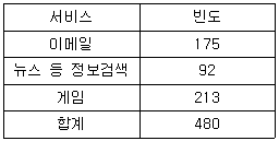 10대 청소년 480명을 대상으로 인터넷 사용 시 가장 많이 이용하는 서비스가 무엇인지를 조사하여 다음의 결과를 얻었다. 서비스 이용 빈도 간에 서로 차이가 없다는 귀무가설을 검정하기 위한 카이제곱 통계량의 값과 자유도는?