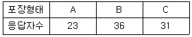다음은 서로 다른 3가지 포장방법(A, B, C)의 선호도가 같은지를 90명을 대상으로 조사한 결과이다. 선호도가 동일한지를 검정하는 카이제곱 검정통계량의 값은?