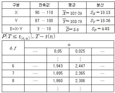 [사회통계] 다음은 왼손으로 글자를 쓰는 사람을 8명에 대하여 왼손의 악력 X와 오른손의 악력 Y를 측정하여 정리한 결과이다. 왼손으로 글자를 쓰는 사람들의 왼손 악력이 오른손 악력보다 강하다고 할 수 있는가에 대해 유의수준 5%에서 검정하고자 한다. 검정통계량 T의 값과 기각역을 구하면?