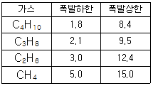 [화학설비위험방지기술] 용적비로 메탄 70%, 프로판 21%, 부탄 9%의 혼합가스가 있다면 이 혼합가스의 공기중에서의 폭발범위는 용적비로 얼마인가? (단, 이들 가스의 공기중에서의 폭발범위는 표에서와 같다.)