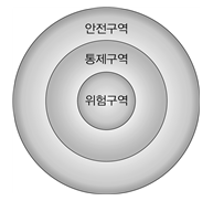 유해화학물질 사고로 오염된 인근 구역을 나타낸 것이다. 제독(제염)을 실행하고 적절한 보호구를 착용해야 하는 구역으로 옳은 것은?