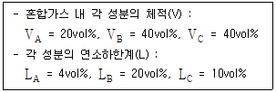 [소방학개론] 가연성 가스 3종이 다음과 같이 혼합되어 있을 때 르샤틀리에(Le Chatelier)식에 따라 부피비로 계산된 혼합가스의 연소하한계[vol%]는?