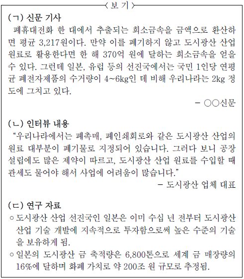 - (ㄱ)과 (ㄷ)을 활용하여, 도시광산 산업이 경제적 가치를 지닌 산업이라는 내용을 뒷받침하는 근거로 제시한다.