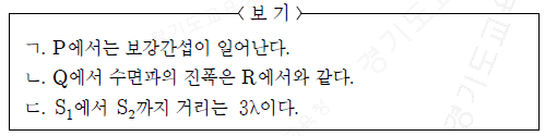 ㄱ. S1과 S2에서 발생한 수면파는 같은 진폭과 진동수를 가지고 있으며, 같은 위상으로 발생하였기 때문에 파동의 중첩으로 인해 파동의 진폭이 더해져서 수면파의 진폭이 더 크게 나타난다.
