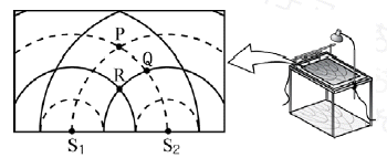 [과목 구분 없음] 그림은 수면파 투영장치의 두 파원 S1과 S2에서 진폭, 진동수가 같은 수면파를 같은 위상으로 발생시켜 얻은 어느 순간의 모습을 나타낸 것이다. 실선과 점선은 각각 수면파의 마루와 골이고, 수면파의 파장은 λ이다.