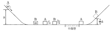 [과목 구분 없음] 그림은 높이 h 인 곳에 가만히 놓인 물체 A가 마찰이 없는 빗면을 내려와 정지해 있던 물체 B와 충돌한 후, A는 v, B는 2v 의 속도로 마찰이 있는 수평면을 향해 등속도 운동하는 것을 나타낸 것이다. A 는 마찰면을 통과한 직후 정지하고, B는 마찰면을 통과하여 마찰이 없는 면을 따라 높이가 2/5h인 최고점에 도달한다. A, B의 질량은 m으로 같고, 마찰면과의 운동 마찰 계수는 각각 μA, μB 이며 μA > μB 이다.