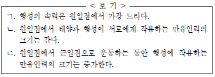 - ㄱ: 태양과 행성 사이의 거리는 타원 궤도에서 가장 가까울 때와 멀 때가 있다. 이 때 태양과 행성 사이의 거리가 가장 가까울 때를 근일점(perihelion), 멀 때를 원일점(aphelion)이라고 한다. 그림에서는 태양을 한 초점으로 하는 타원 궤도의 원일점을 지나는 모습이므로, ㄱ이 옳다.