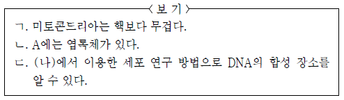 보기에서 "ㄴ"은 DNA의 구성 물질인 티민을 방사성 동위 원소 3H로 표지하여 세포에 주입한 후 관찰한 결과를 나타내고 있으며, "ㄷ"는 그림 (가)에서 식물 세포를 파쇄한 후 원심 분리기를 이용하여 세포 소기관을 분리하는 과정을 나타내고 있기 때문에 정답은 "ㄴ, ㄷ"입니다.