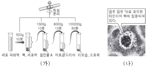 [과목 구분 없음] 그림 (가)는 식물 세포를 파쇄한 후 원심 분리기를 이용하여 세포 소기관을 분리하는 과정을, (나)는 DNA의 구성 물질인 티민을 방사성 동위 원소 3H로 표지하여 세포에 주입한 후 관찰한 결과를 나타낸 것이다.