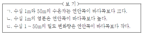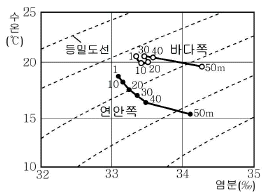 그림은 2008년 11월 부산 해역의 연안쪽, 바다쪽에서 측정한 수온과 염분을 수심(m)에 따라 수온-염분도에 나타낸 것이다.