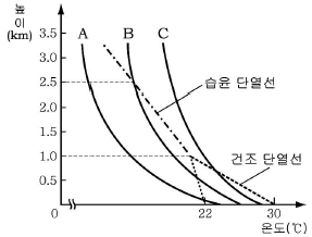 그래프는 서로 다른 세 지역 A~C에서 높이에 따른 기온 변화를 나타낸 것이다.
