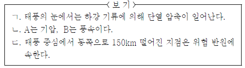 그림은 북반구 중위도에서 북상하는 태풍의 동서 방향 단면과 기상 요소의 변화를 나타낸 것이다.