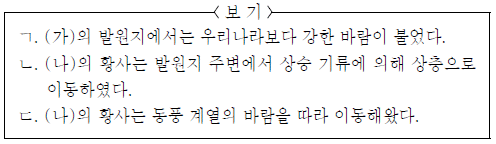 그림 (가)는 황사가 발원한 2009년 어느 날 우리나라 주변의 일기도를, (나)는 이로부터 며칠 후 우리나라의 상층 대기에 나타난 황사 모습을 나타낸 것이다.