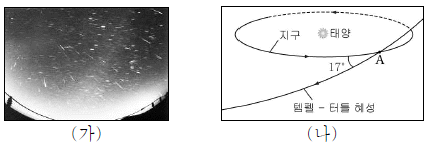 그림 (가)는 2009년 11월 18일에 나타난 사자자리 유성우를, (나)는 이 유성우와 관련된 템펠-터틀 혜성의 공전 궤도의 일부와 지구의 공전 궤도를 나타낸 것이다.