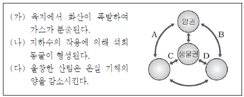 다음은 탄소의 순환 과정에서 일어나는 현상과 지구 환경 구성 요소의 상호 작용을 나타낸 것이다.