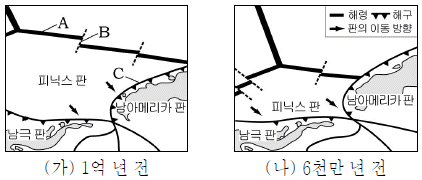 그림 (가), (나)는 남극 반도 주변 판의 경계 A~C의 변화와 피닉스 판의 이동 방향을 나타낸 것이다.