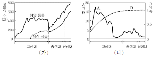 그래프 (가)는 현생 이언 동안 생물의 과의 수 변화를, (나)는 같은 기간 대기 중 이산화탄소량과 산소량의 변화(현재=1)를 나타낸 것이다.