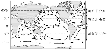 그림은 전 세계에서 일어나는 해수의 표층 순환을 나타낸 것이다.