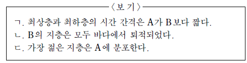 A와 B에 분포하는 지층에 대한 설명으로 옳은 것만을 <보기>에서 있는 대로 고른 것은? (단, 퇴적 이후 지층의 역전은 없었다.) [3점]
