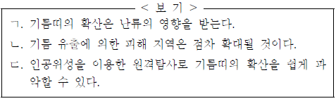 - ㄴ: 바람이 남서쪽에서 북동쪽으로 불어 기름띠가 북동쪽으로 이동할 것이라는 예상이다.