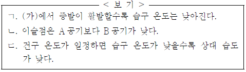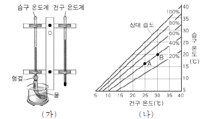 그림 (가)는 건습구 온도계를, (나)는 건구 온도와 습구 온도에 따른 상대 습도를 나타낸 것이다.