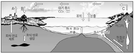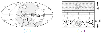 그림 (가)는 어느 지질 시대의 수륙 분포를, (나)는 어느 지역의 지층에서 산출된 화석을 나타낸 것이다.