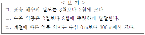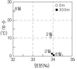 그림은 동해에서 2월과 8월에 수심 0 m와 300 m에서 측정한 수온과 염분을 나타낸 것이다.