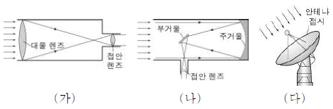 그림 (가), (나), (다)는 세 종류의 망원경의 모식도이다.