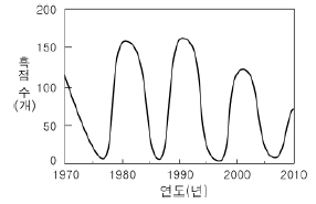 그림은 1970년부터 약 40년 동안 관측된 태양 흑점 수의 변화를 나타낸 것이다.