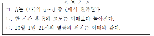 그림 (가)는 9월 1일 23시에 맞춘 별자리보기판에 별 A, B의 위치를 표시한 것이며, (나)는 이때의 북쪽 하늘을 나타낸 것이다.