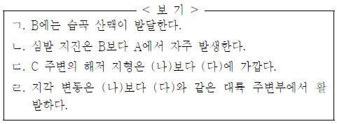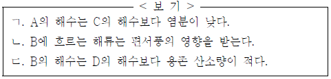 A ~ D 해역에 대한 옳은 설명만을 <보기>에서 있는 대로 고른 것은? [3점]