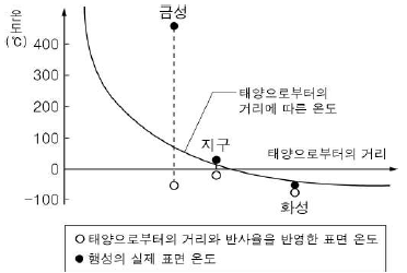 그림은 태양으로부터의 거리에 따른 온도와 세 행성의 표면 온도를 나타낸 것이다.