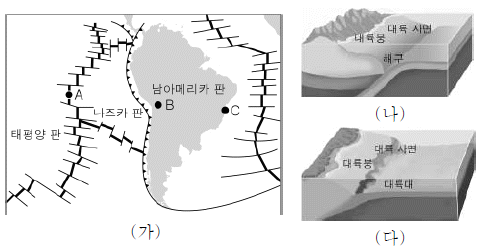 그림 (가)는 남아메리카 주변의 판 경계를, (나)와 (다)는 서로 다른 대륙 주변부의 모습을 나타낸 것이다.