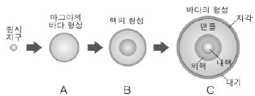그림은 원시 지구의 진화 과정을 단계별로 나타낸 것이다.