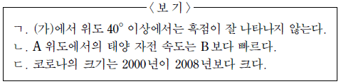 그림 (가)는 1996 년부터 최근까지 관측한 모든 흑점을 위도별로 나타낸 것이고, (나)는 태양의 위도별 자전 주기를 나타낸 것이다.