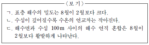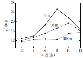 그림은 표층 염분의 변화가 거의 없는 어느 해역에서 두 달 간격으로 측정한 수온 변화를 수심별로 나타낸 것이다.