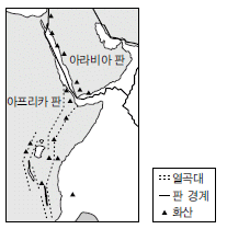 그림은 동아프리카 열곡대 주변의 판 경계와 화산 분포를 나타낸 것이다.