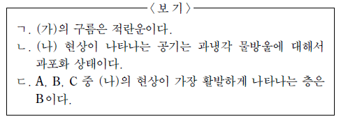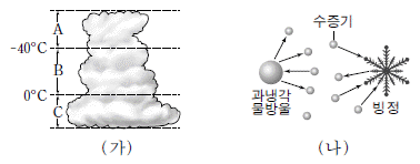 그림 (가)는 중위도 지방에 발달한 구름을 온도에 따라 A, B, C층으로 구분한 것이고, (나)는 이 구름의 어느 층에서 일어나는 수증기 이동을 모식적으로 나타낸 것이다.