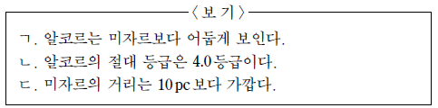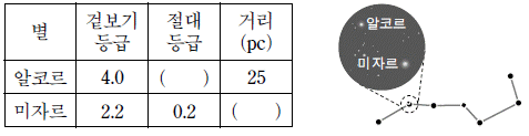 표는 북두칠성에 있는 두 별 알코르와 미자르의 물리량을 나타낸 것이고, 그림은 이 두 별을 망원경으로 관측한 모습이다.