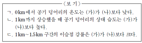 그림 (가)와 (나)는 서로 다른 두 지역에서 공기 덩어리가 단열 상승하는 동안 이슬점의 변화를 나타낸 것이다.