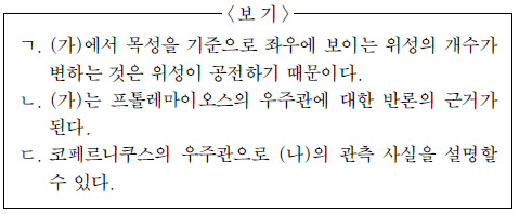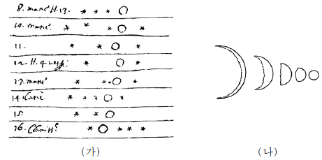 )을, (나)는 금성의 위상 변화를 갈릴레이가 망원경으로 관측하여 그린 것을 각각 나타낸 것이다.
