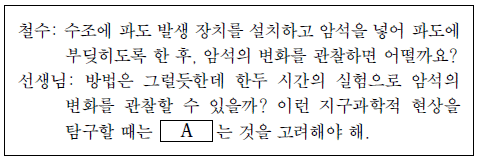 다음은 해파에 의한 암석의 침식 현상을 탐구하기 위해 철수가 선생님과 나눈 대화의 일부이다.