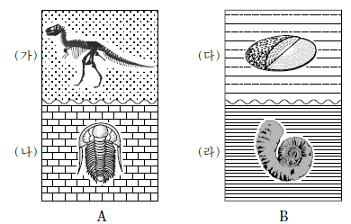 그림은 서로 다른 지역 A와 B에 분포하는 지층 (가)∼(라)에서 산출되는 표준 화석을 나타낸 것이다.