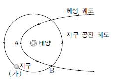 그림은 어느 혜성과 태양의 위치 관계를 나타낸 것이다. (가)는 혜성이 B를 통과할 때 지구의 위치이다.