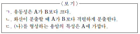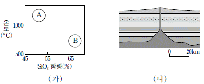 그림 (가)는 용암 A와 B의 특성을, (나)는 어느 화산체의 단면을 모식적으로 나타낸 것이다.