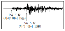 그림은 어느 지진 관측소에 기록된 지진 기록을 나타낸 것이다.